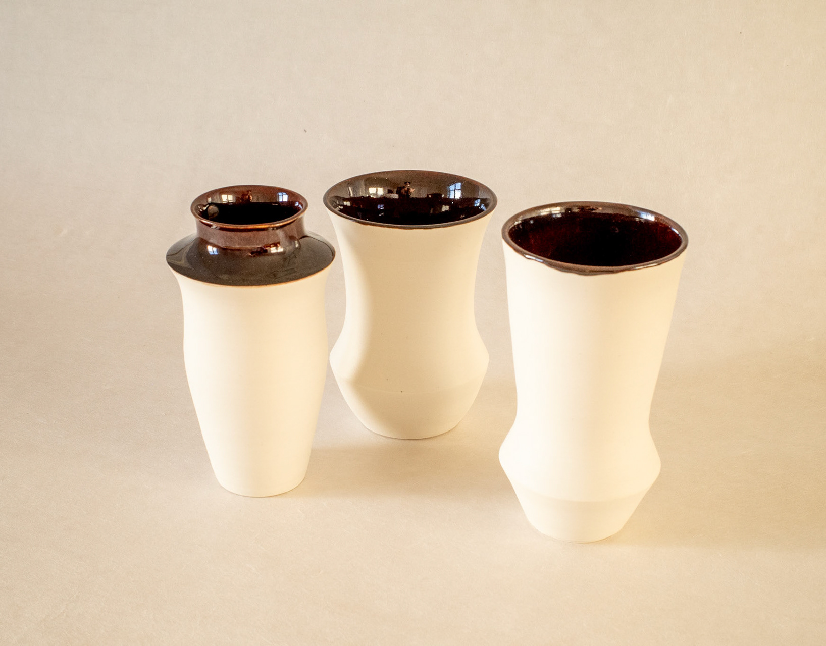 This is a test batch of “split cups,” starting with thrown cylinders and truncated cones to find the best shape for cutting and rejoining. The split design is intended to divide and block the pouring glaze pattern.