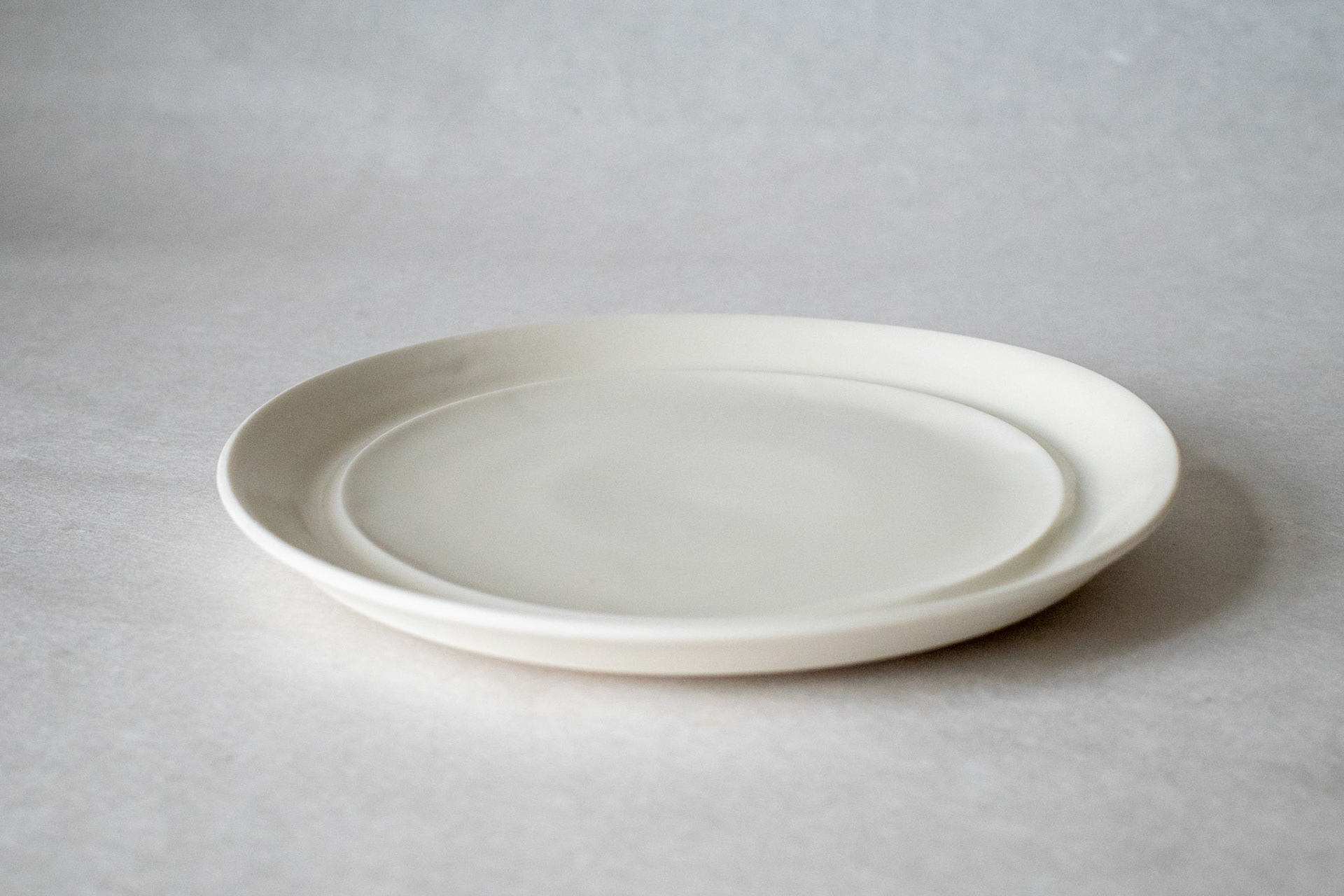 I design and throw this 22 cm plate as a wedding gift for my friends Alexandra and Rob. Designed for daily use, its low outer ring is ideal for pastries or saucy dishes, and the raised inner ring adds a refined touch by subtly elevating the food.