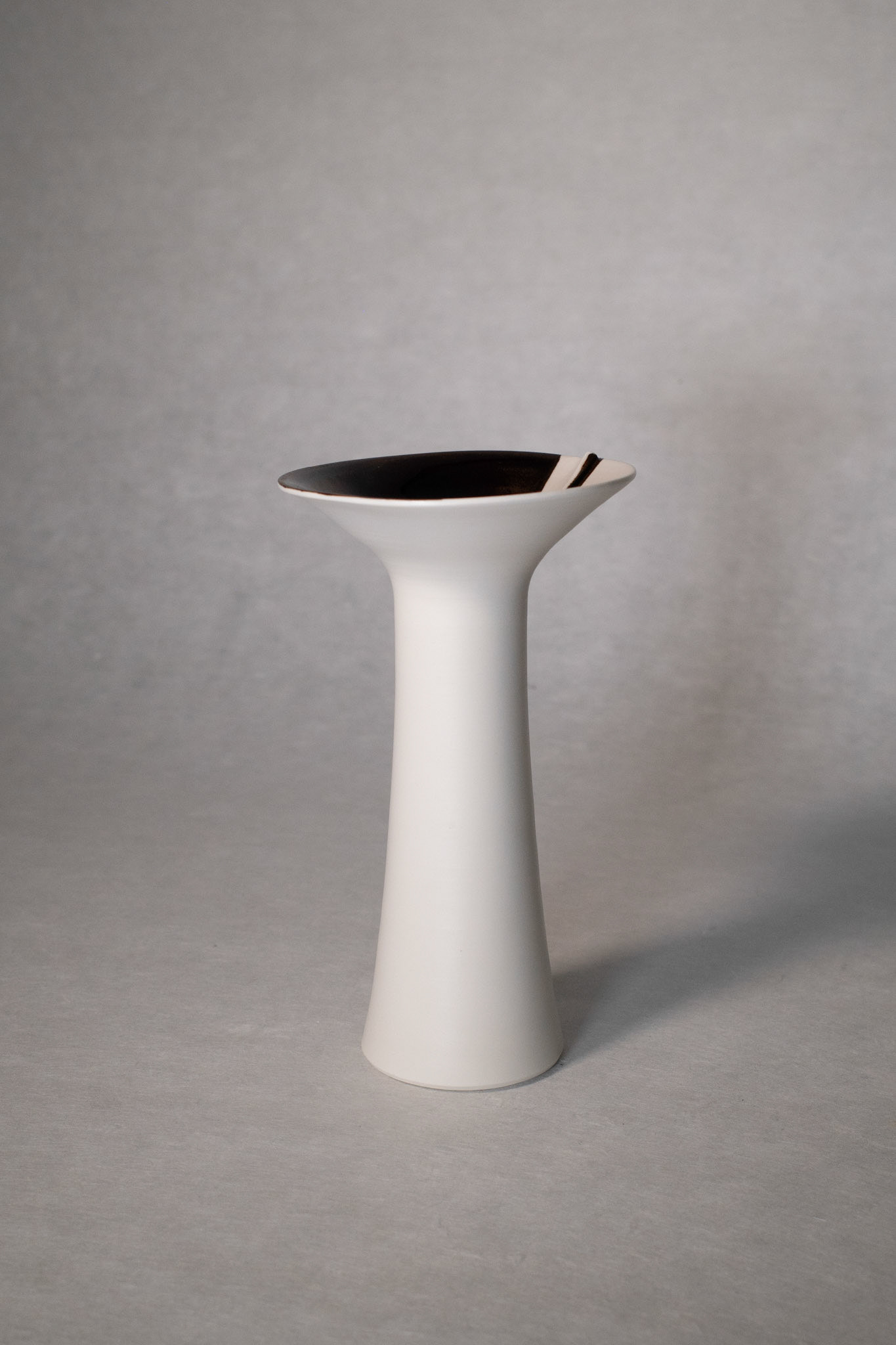 Throwing these porcelain vases only had three pulls chance. After that, the clay gives in to gravity. The top resembles a floating lily or lotus, and the white porcelain splits the dark glaze into streams, creating a small landscape. All 19~20cm tall