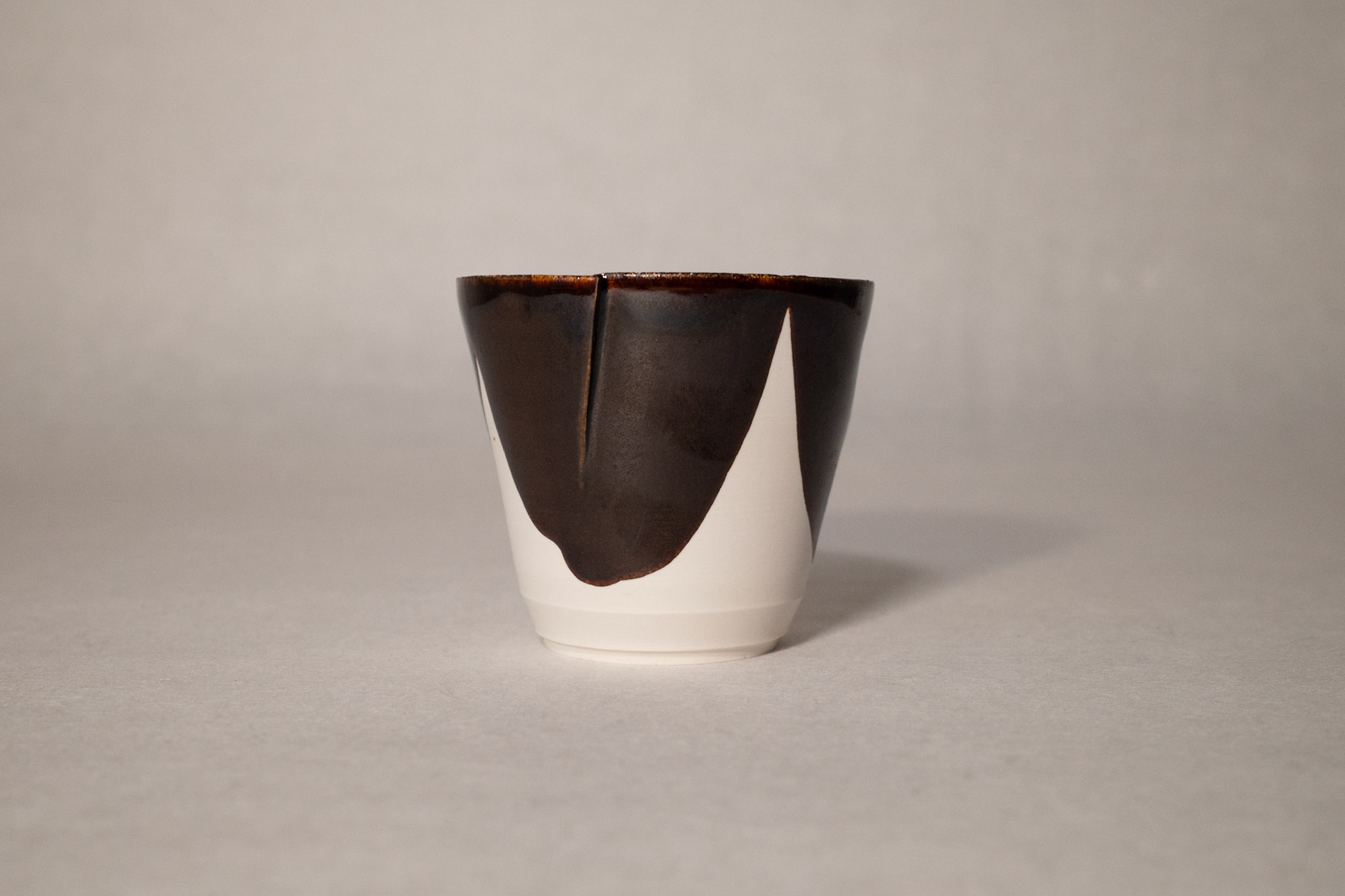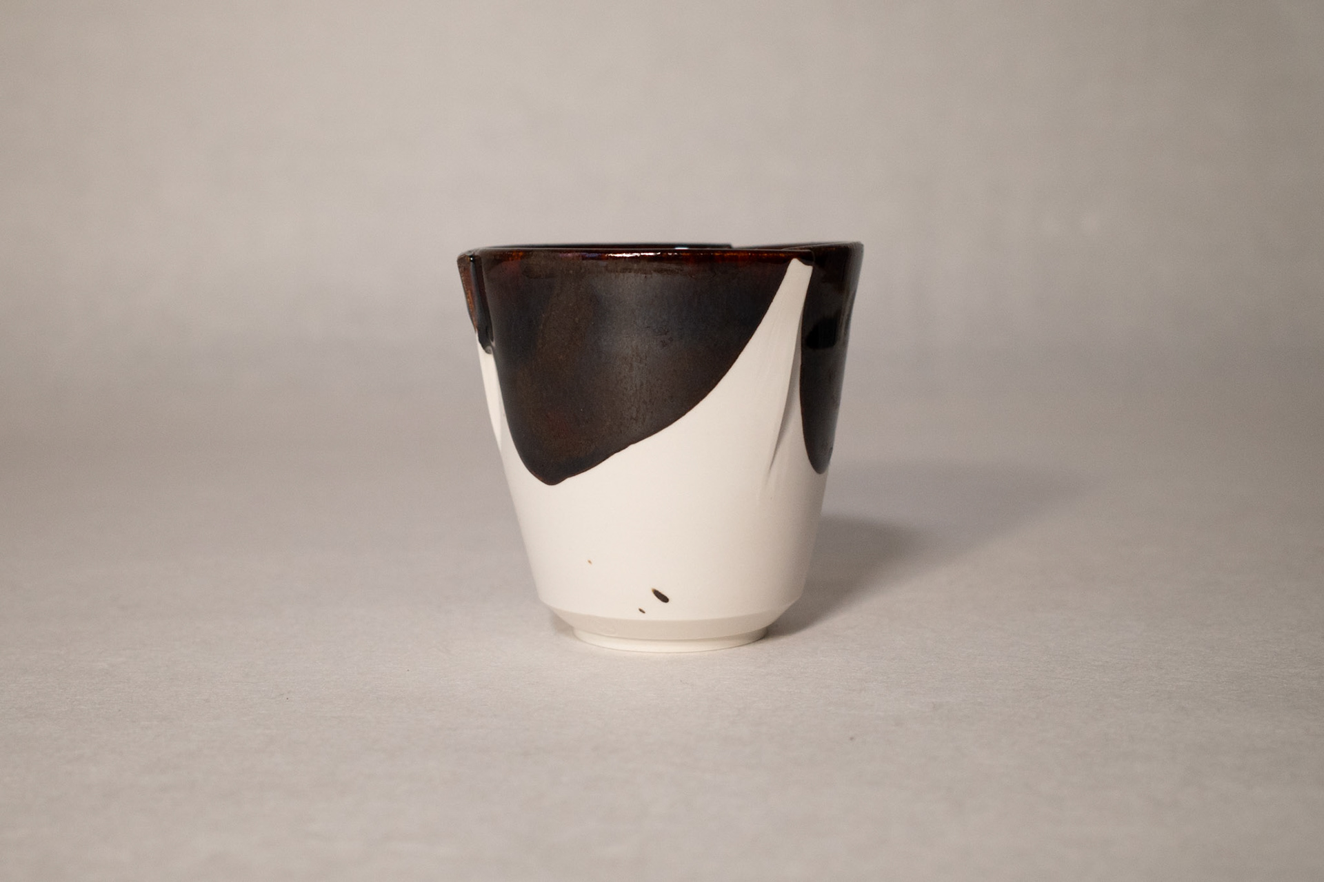 This is a test batch of “split cups,” starting with thrown cylinders and truncated cones to find the best shape for cutting and rejoining. The split design is intended to divide and block the pouring glaze pattern.