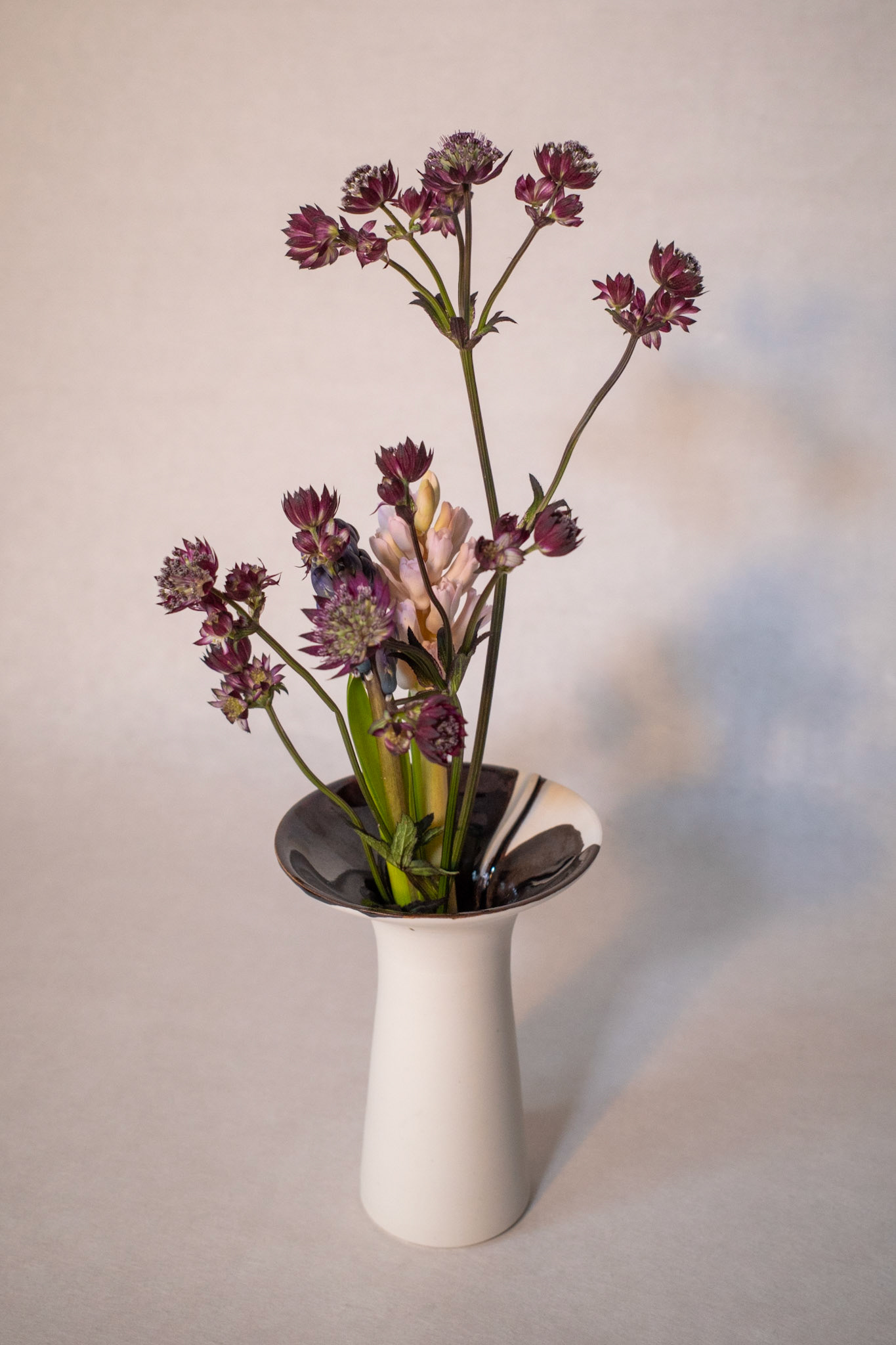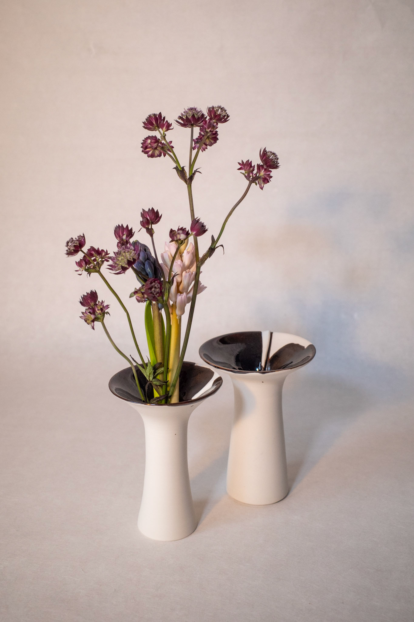 This horn-shaped vase features a tenmoku glaze and is designed to keep flowers upright. The top resembles a floating lily or lotus, and the contrast between the remaining white porcelain and the dark glaze creates a small “landscape”.