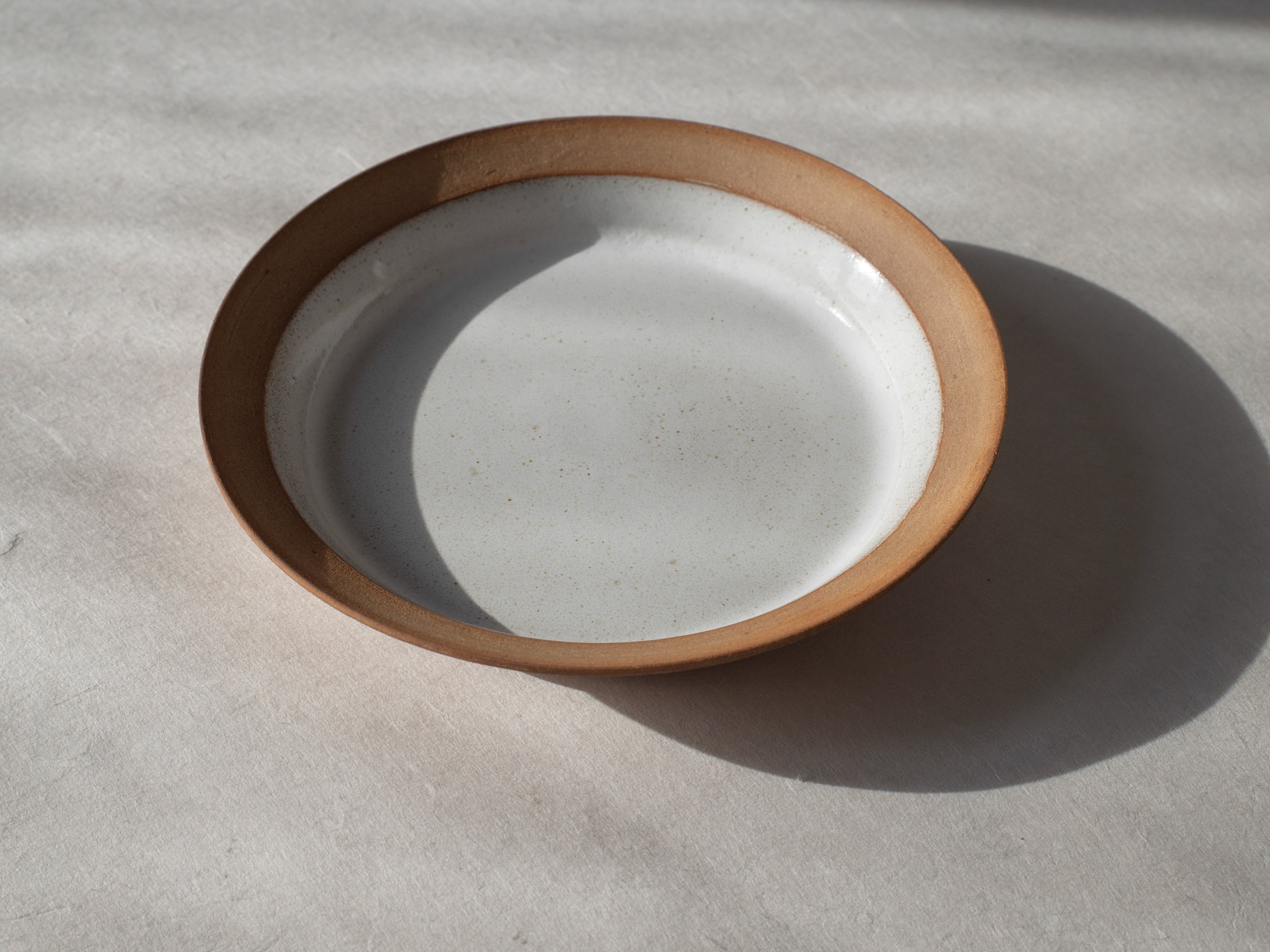 I design and throw this 22 cm plate as a wedding gift for my friends Alexandra and Rob. Designed for daily use, its low outer ring is ideal for pastries or saucy dishes, and the raised inner ring adds a refined touch by subtly elevating the food.